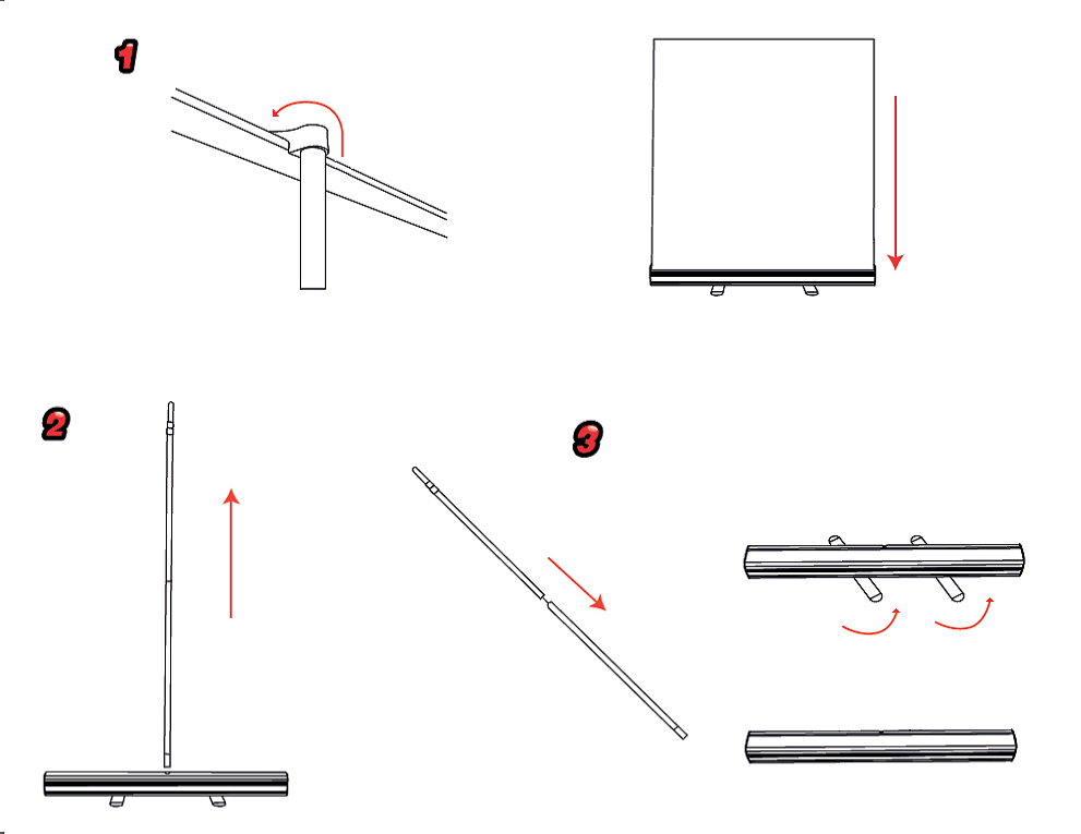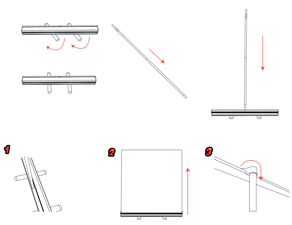 - Retournez le ou les pieds parallèlement à l’axe du roll-up (sauf pour les enrouleurs premium qui n’ont pas de pied visible).